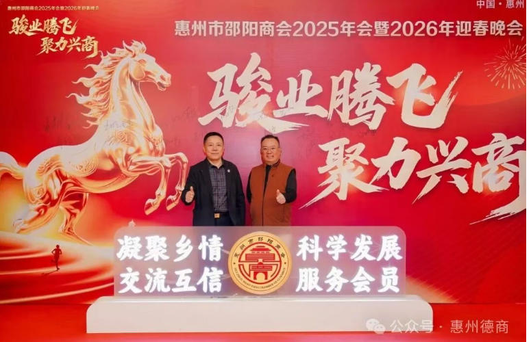 1月9日下午,以“骏业腾飞,聚力兴商”为主题的惠州市邵阳商会2025年会暨2026迎春晚会在康帝国际酒店圆满举行。相关部门领导嘉宾、兄弟商会代表、在惠邵籍乡贤及全体会员共500余人欢聚一堂,共赴这场承载乡情的年度盛会。我会会长陈建华、秘书长张良臣应邀参加了迎春晚会。